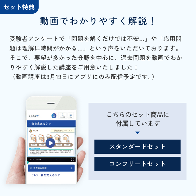 重要問題解説動画講座とは・・・ 受験者アンケートで「問題を解くだけでは不安…」や「応用問題は理解に時間がかかる…」という声をいただいております。 そこで、要望が多かった分野を中心に、過去問題を動画でわかりやすく解説した講座をご用意いたしました! (動画講座は9月19日にアプリにのみ配信予定です。) 【スタンダードセットもしくはコンプリートセットをご購入のお客様】にのみ、特別特典としてオリジナル問題を解説した重要問題解説動画講座を付属します。